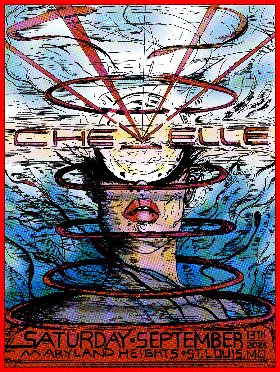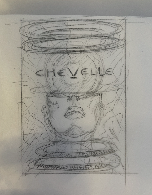 I first really connected with Chevelle after a 2023 St. Louis show, and by the time I was invited to see them again in 2025, I knew I wanted to create a poster for their upcoming date. Their new album Blight as Blasphemy—especially the track “Karma Goddess”—sparked the vision of a goddess-like figure erupting with kinetic, shockwave-like energy as a metaphor for ignition and rebirth. The show was incredible, but the moment a fan ran back to high-five and hug me over the poster is what reminded me why I make this art in the first place.
