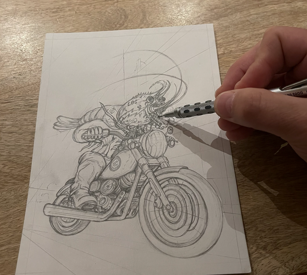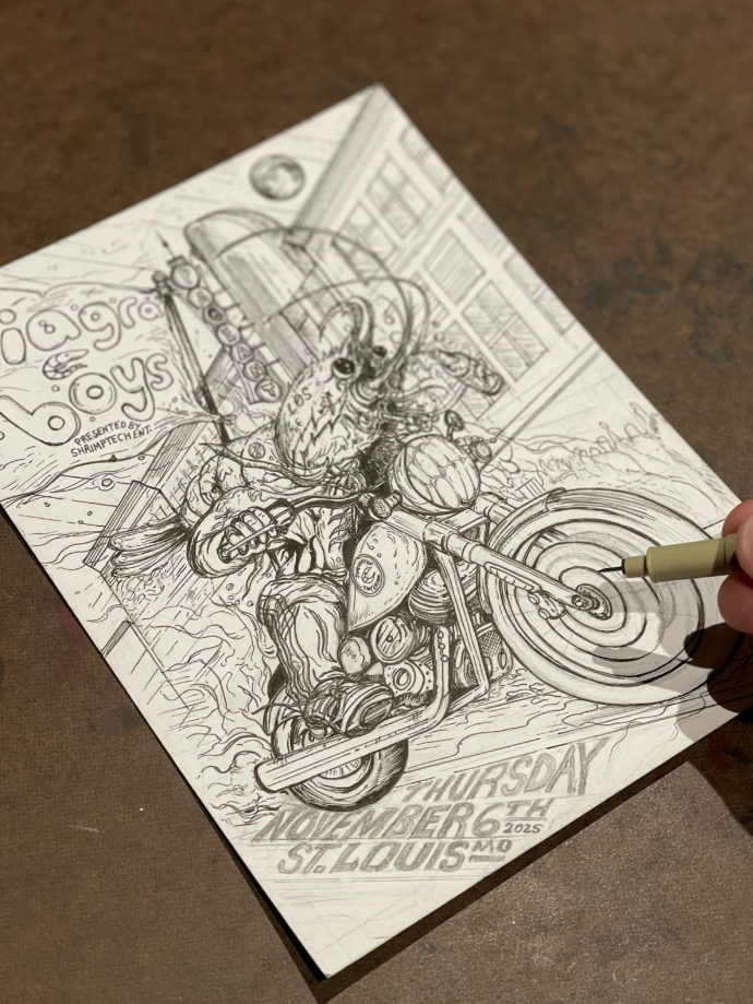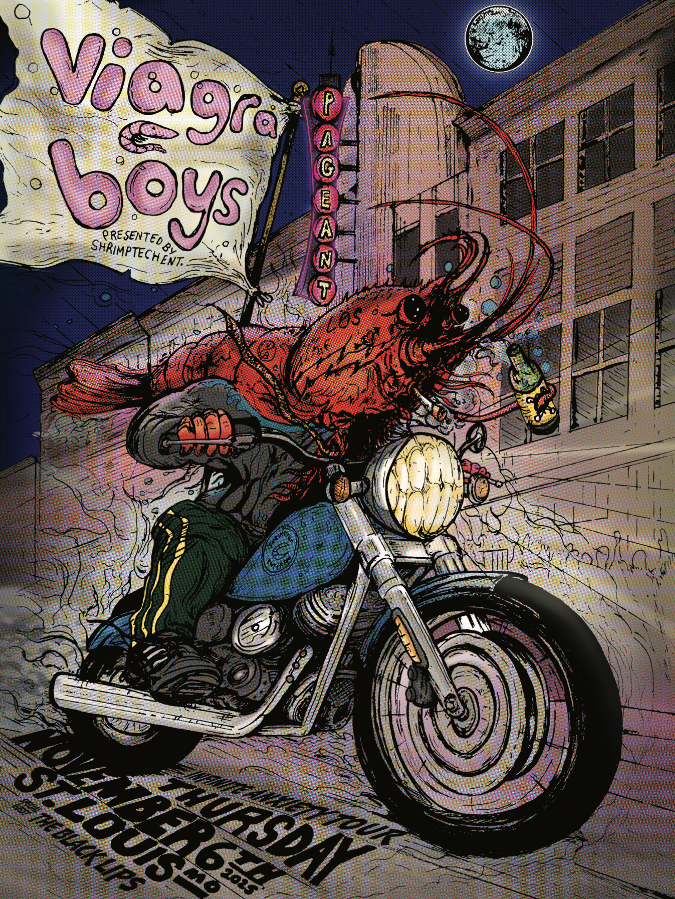 I first discovered the Viagra Boys when they opened for Queens of the Stone Age in St. Louis in 2023, and the tune “Shrimp Shack” instantly hooked me. When I saw they were returning to the Pageant in 2025, I knew I had to create something for the show, inspired by a Florida beach trip where a helmet-less biker and a plate of frozen shrimp weirdly fused in my brain. That mashup became SHell On Wheels - a badass crustacean biker ripping toward the V-Boys Shrimp Shack, probably to go hang out with your mom.